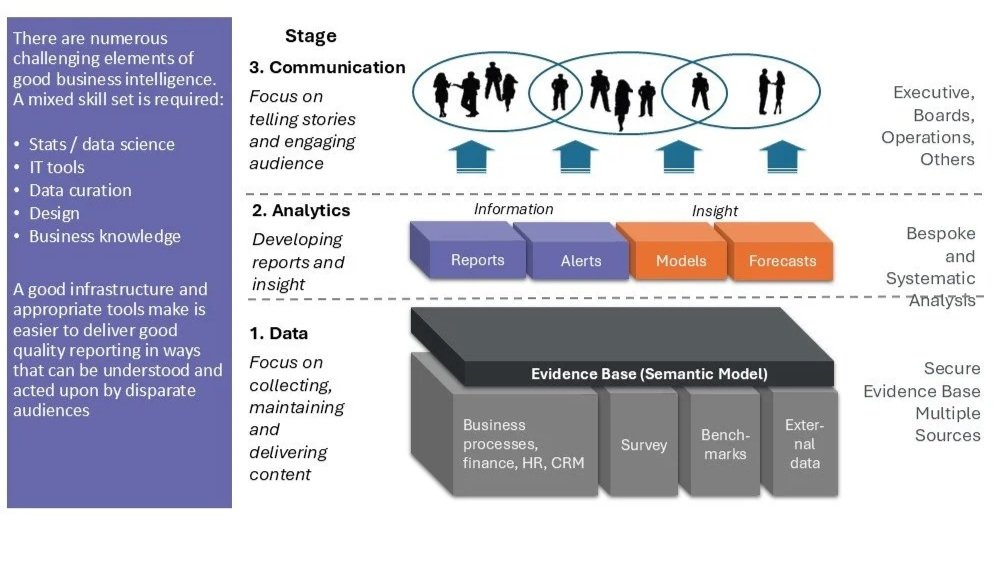 The diagram below illustrates the three main stages to produce good analytics, required a broad range of skills and understanding of the end user.
